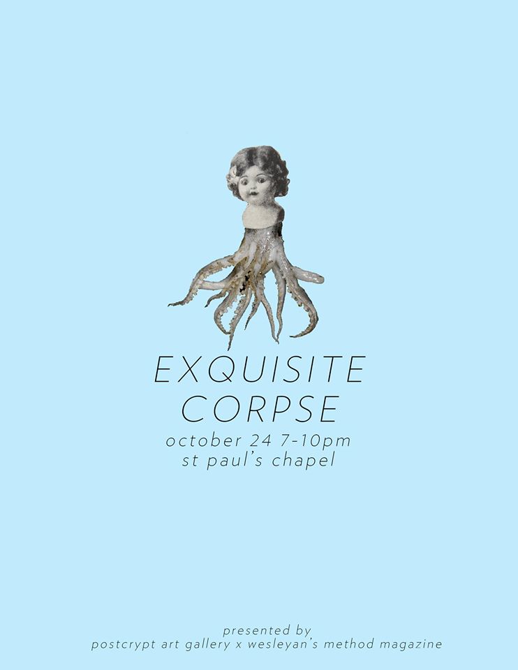 October 24th, 2014Based on the classic Surrealist game, Exquisite Corpse is a month-long project facilitated by Columbia's Postcrypt Art Gallery in collaboration with Wesleyan's Method Magazine.